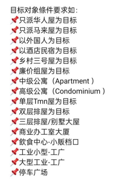 即指您的目标对象條件要求是怎样的?如:只要派华人住宅而已,或只要派双层华人屋而已,或只要派店屋或工广而已,还是只要派马来人屋而已,或是要在店屋的周围几英哩而已。