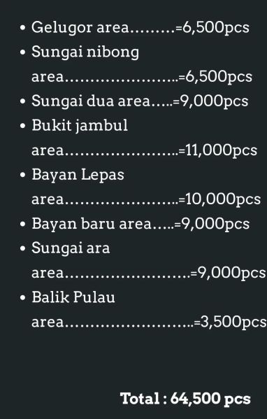 檳島Bayan Lepas地區,傳單派送服務區域,普遍性派送至住宅信箱。需要傳單紙张數量:10,000pcs。